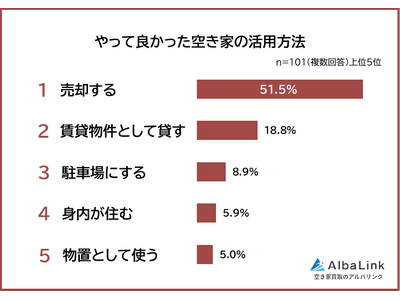 株式会社AlbaLink(本社:東京都江東区、代表取締役:河田 憲二)は、自身や家族が空き家を相続した経験がある101人を対象に「やって良かった空き家の活用方法に関する意識調査」を実施し、そのデータをランキングにしました。