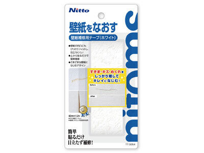 壁紙にできた小さなキズや破れ、すきま、はがれなど、さまざまな悩みを“貼るだけ”で手軽に解決できる壁紙補修用のテープです。当社が実施したアンケートでは、壁紙で補修したい箇所として、1~2cm程度のキズや破れ、すきま、はがれなどが特に多く挙げられていることがわかりました。様々な状況に柔軟に対応するため、開発した本製品は、広幅テープ仕様により、一般的な小さめのシールタイプの補修材では対応が難しかった縦長の傷みや大きめのキズ、すきまを簡単に補修することが可能になりました。また、しっかりと密着することで、壁紙の浮きやはがれも抑えることもできます。壁紙の凹凸にしっかりと追従する柔らかく薄手の基材を採用し、表面には、様々な色・柄になじむモザイク印刷を施しているので、補修後も違和感のない自然な仕上がりを実現します。ホワイト系の壁紙にあわせやすいホワイトとベージュ系の壁紙に調和するベージュの2色展開です。