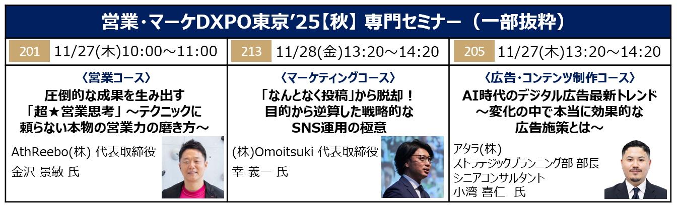 営業コースでは、『超★営業思考』等の著者として知られるAthReebo(株) 代表取締役 金沢景敏氏が、圧倒的な成果を生み出す営業マンになるためのスキルセットとマインドセットを解説。またマーケティングコースでは、SNSを活用した採用や集客の支援を行う(株)Omoitsuki 代表取締役 幸義一氏が、目的から逆算して投稿内容を設計する戦略的なSNS運用法を紹介する。他にも営業・マーケ部門をはじめ、売上アップ・生産性向上を目指す経営者必聴のセミナーが多数開催される。