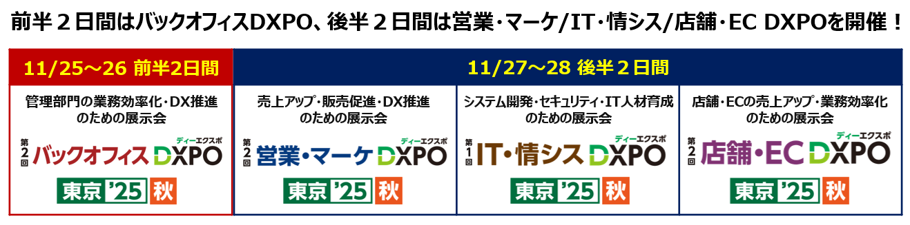 代表取締役社長 新村祐三、東証グロース上場 証券コード:9272)は、11月27日(木)・28日(金)の2日間「第2回 営業・マーケDXPO東京’25【秋】」を有明GYM-EX(ジメックス)にて盛大に開催する。来場対象者は、DX推進に課題を持つ経営層に加え、営業、マーケティング、Web担当、集客・販促・PR担当の方々である。