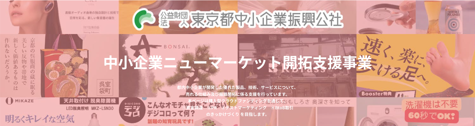 公社が実施している中小企業向けの販路開拓支援、即ち「中小企業ニューマーケット開拓支援事業」の支援製品を対象とし、その中から選出された製品・企業に対し、近年新たな販路開拓支援ツールとして注目を集める購入型クラウドファンディングを経験する機会を積極提供致します。特にアドバイザーによるオーダーメイドの支援が好評を博し、掲載者にとって満足度の高い支援です。