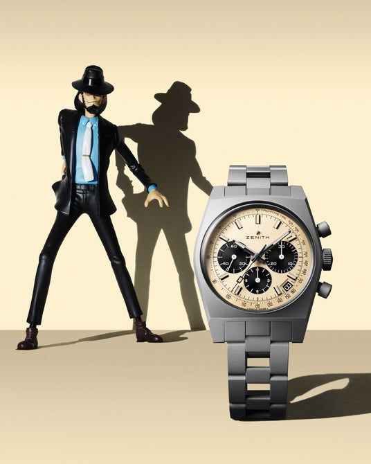 それから数十年の時を経て、ゼニスはこのフィクションを現実のものにし、次元の時計にオマージュを捧げる3つの限定モデルを発売しました。2019年にリリースした第1弾は50本限定のスチールモデルで、ブラック文字盤に金箔のアクセントを施しています。さらに、アニメでの描写に忠実に、アワーマーカーをより小さくし、ゼニスのロゴにさりげなくアレンジを加えたユニークピースを、フィリップスのオークションに出品しました。2020年に登場した第2弾は200本限定のスチール製クロノグラフで、ホワイトの背景にブラックカウンターを配した「パンダ」文字盤を採用しました。そして、2021年に発表した250本限定の第3弾では、ブラックモデルとシルバーモデルを大胆に組み合わせたアシンメトリーデザインの文字盤を誕生させました。
