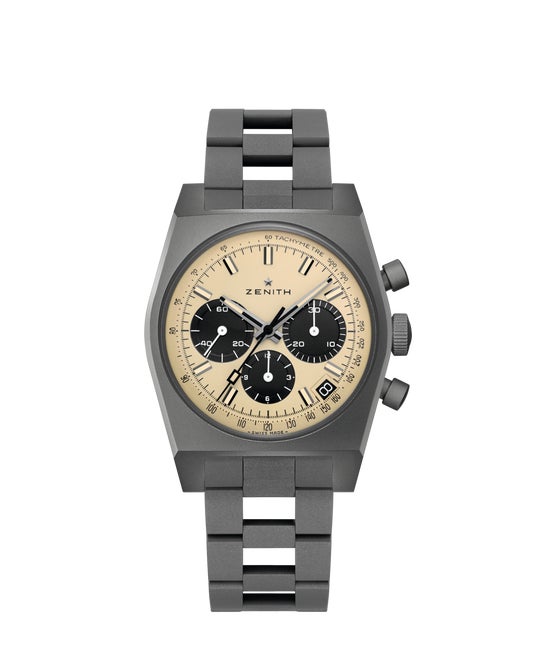 「クロノマスター リバイバル 次元大介エディション」は、著名なゲイフレアー社が1969年にゼニスのためにデザインしたアイコニックなラダーブレスレットを備えています。A384、A385、A386など最初期のエル・プリメロモデルの一部に採用されたラダーブレスレットは、中央のリンクが交互に中抜きされ、軽量性と快適性を備えることでその名を知られています。今作ではラダーブレスレットがマット仕上げのチタンを用いてよみがえり、伝統と現代の人間工学の融合を体現します。