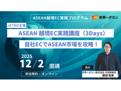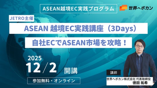世界へボカン株式会社(東京都豊島区、代表取締役:徳田祐希)は、JETROが実施する「ASEAN越境EC販路開拓事業」の一環として開催される『E-commerce Academy マーケティング実践編』にて、講師を務めることをお知らせします。