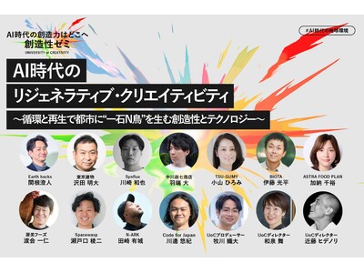 この度UoCは、研究テーマ「AI時代の創造力はどこへ」のもと、創造性ゼミ「AI時代のリジェネラティブ・クリエイティビティ」を新設し、受講生募集を開始しました。本ゼミでは、都市を再生するための多様なAI/テクノロジーの先端事例を多数のゲストから学びながら、対話を通じて「リジェネラティブ・クリエイティビティ」を広く活用できる形にアップデートし、参加者ひとりひとりが都市に“一石N鳥”を生む具体案を考えることを通じて、気候危機時代の課題解決の解像度を高めることを目指します。