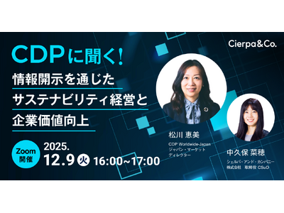 シェルパ・アンド・カンパニー株式会社(本社:東京都品川区、代表取締役CEO 杉本淳、以下「シェルパ」)は、一般社団法人 CDP Worldwide-Japan(以下「CDP」)からジャパンマーケットディレクターの松川恵美氏をゲストに招き、「CDP」の最新動向や企業に求められるサステナビリティ情報開示対応のポイントを解説するウェビナーを2025年12月9日(木)に実施します。