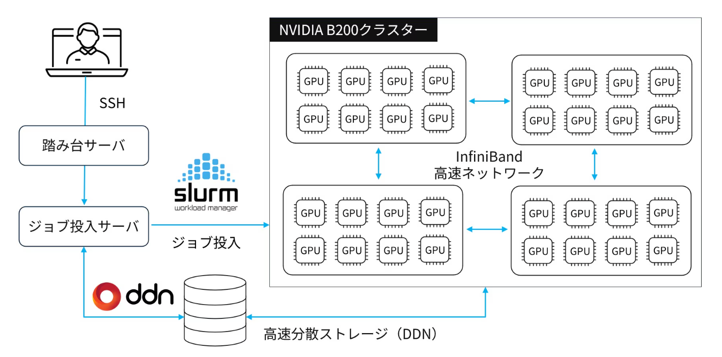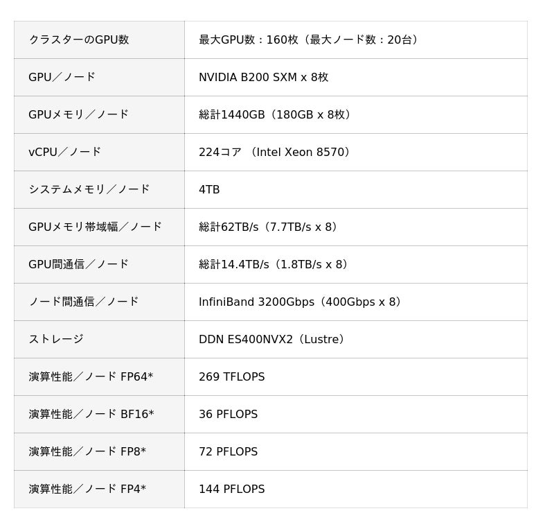 NVIDIA B200は、前世代のH100と比較して圧倒的な性能を誇ります。学習速度は3倍、GPU間通信も3倍に高速化され、さらにGPUメモリ容量は2倍以上に向上。加えて、ノード間のネットワークにはEthernetを上回る高速なInfiniBandを採用し、次世代の計算負荷にも対応します。