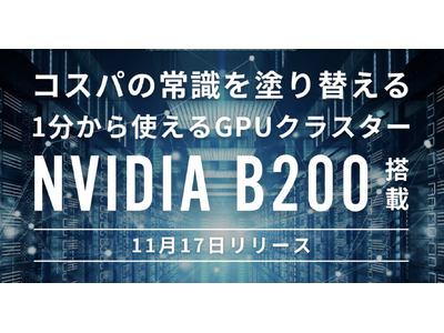 GPUクラウドサービス「GPUSOROBAN」を展開する株式会社ハイレゾ(本社:東京都新宿区、代表取締役:志倉喜幸、以下当社)は、10月7日に「NVIDIA B200搭載マルチノード型ハイエンドGPUクラスタ」として発表していたサービスにつきまして、NVIDIA B200クラスター構成の環境をGPU1枚・1分単位の課金で提供し、新たにポイント制を導入した「GPUSOROBAN 計算クラスター B200」として、本日付で正式リリースしましたことをお知らせいたします。