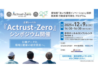 株式会社スタジオスポビー(本社:東京都渋谷区、代表取締役:夏目恭行)は、2025年12月9日(火)、中日ホール&カンファレンス(名古屋市栄)にて愛知県の「あいち環境イノベーション」採択プロダクトである行動変容アプリ「SPOBY(スポビー)」を基盤とした、「行動変容」を企業の脱炭素経営に直結させる企業レーベル『Actrust-Zero(アクトラスト・ゼロ)』シンポジウムを開催いたします。