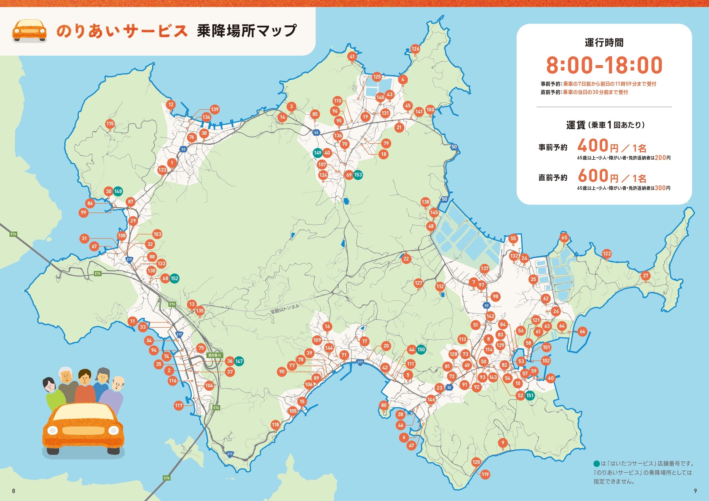 約150か所から乗れる「のりあいサービス」――利用は簡単、電話でもWEBでも予約可能 「のりあいサービス」は、島内に設けた約150か所の乗降ポイント間を自由に移動できる乗合型の公共交通です。予約は、専用ダイヤル(受付8:00~18:00)またはWEBから、乗車の7日前から前日11時59分までの事前予約、当日30分前までの直前予約に対応しています。運賃は、事前予約400円/人、直前予約600円/人(いずれも1回あたり)。支払いは降車時に現金で、WEB予約ではクレジットカード決済もご利用いただけます。
