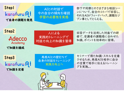 NTTビジネスソリューションズ株式会社(本社:大阪市北区、代表取締役社長:木上秀則、以下「NTTビジネスソリューションズ」)と、人財サービスのグローバルリーダーであるAdecco Groupの日本法人で、総合人事・人財サービスを展開するアデコ株式会社(本社:東京都千代田区、代表取締役社長:平野 健二)の人財派遣およびアウトソーシング事業のブランドであるAdecco(以下「Adecco」)は、企業の管理職育成およびダイバーシティ経営の推進を支援するため、生成AIを活用したアンコンシャスバイアスのチェック・トレーニングツール「karafuru AI(カラフルAI)※1」と、Adeccoが提供する「1on1コミュニケーションプログラム※2」を連携させた新たな研修プログラム(以下「本サービス」)の提供を開始します。