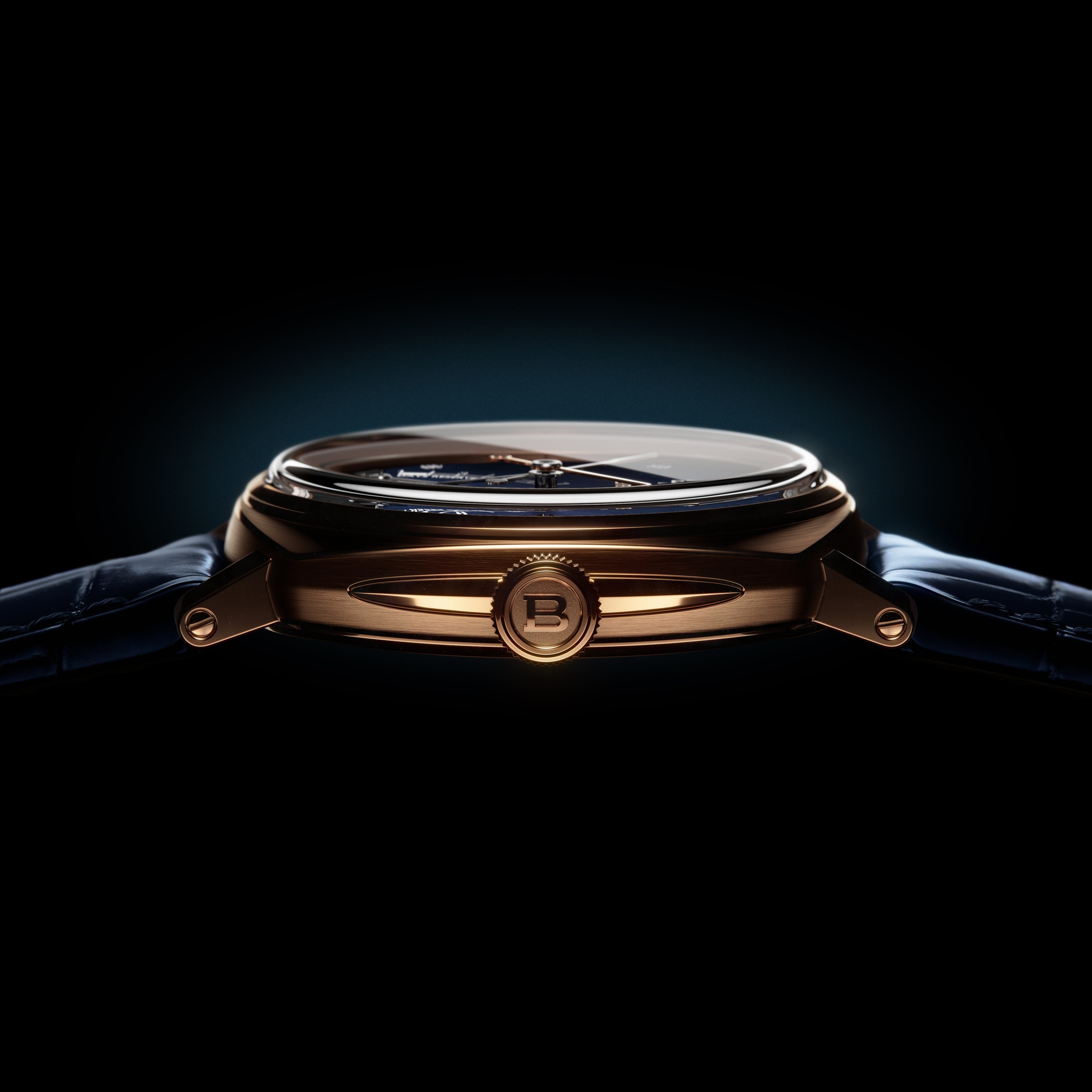 18K 5N+ ローズゴールド製のクッション型ケース(直径41mm/厚さ11.10mm)は、エレガントでありながらスポーティな印象を併せ持ち、50メートル防水を実現しています。