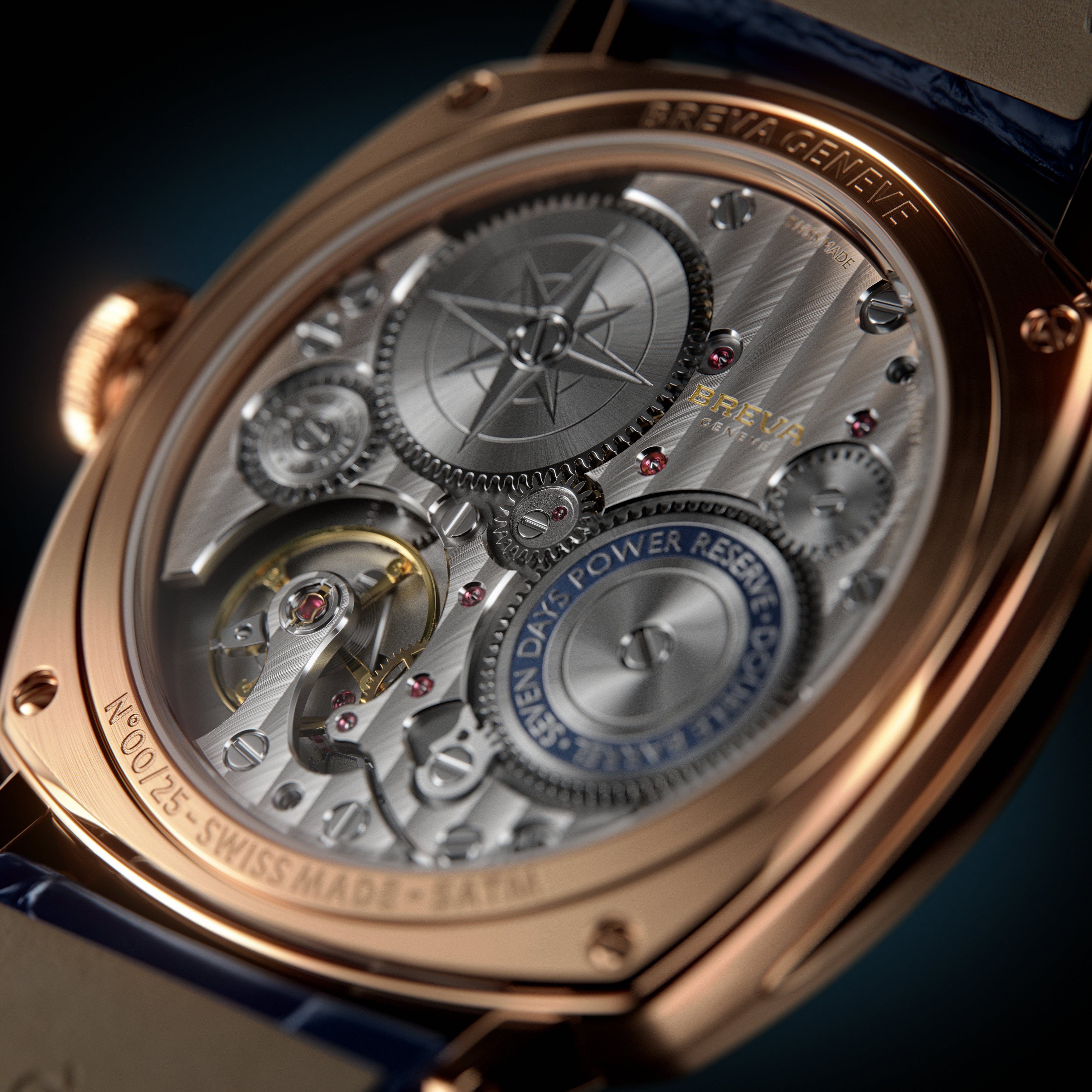 ムーブメントは、名匠 ジャン=フランソワ・モジョン率いるクロノード社によってBREVA専用に開発された手巻きキャリバー。