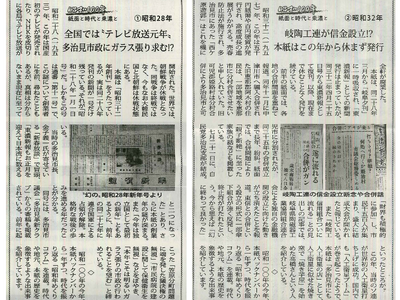 地域の出来事が非常にコンパクトに綴られていて、読みやすく面白い連載。紹介する出来事も政治、社会、文化の話題に限定せず、テレビ放送、美濃焼業界、岐阜国体など多岐にわたっていることも興味深い。