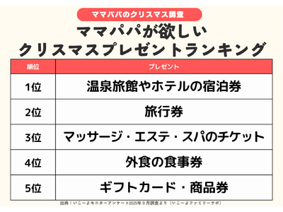 発表!「ママ・パパが自分のために欲しいクリスマスプレゼント」ランキング 2位は「旅行券」 1位は?「マッサージ・エステ・スパのチケット」は何位?/いこーよファミリーラボ調査2025