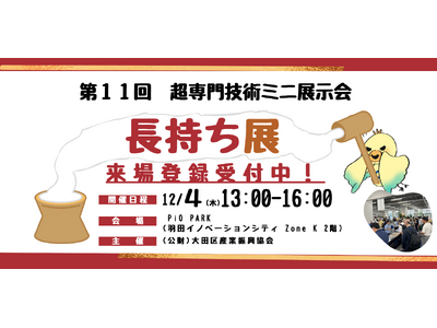 大田区産業振興協会(本社:東京都大田区、理事長:川野正博)は、製品の高耐久化から修理・長期利用、社会インフラのメンテ効率化など、「長持ち」をテーマにした超専門技術ミニ展示会「長持ち展」を、12月4日(木)に羽田イノベーションシティ内のPiO PARKにて開催します。