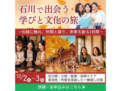 女性起業家支援協会(FEA)は、2025年12月2日(火)~3日(水)の2日間、石川県小松市にて「石川で出会う、学びと文化の旅―伝統に触れ、仲間と語り、未来を創る2日間―」を開催します。本イベントには、FEA主宰のギール里映氏、仁蓉まよ氏、土岐あい氏が同行します。