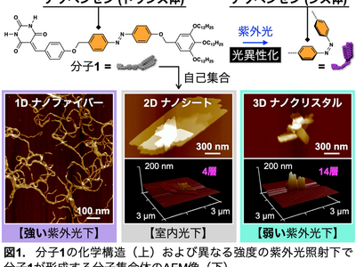 研究チームは、フォトクロミック分子の構造変化(光異性化(注4))と、分子集合体の構造多様性(超分子多形(注5))を組み合わせることで、照射する光の強度によって異なる次元性を持つ3種類の集合構造(一次元ナノファイバー、二次元ナノシート、および三次元ナノクリスタル)を作り分けることに成功しました(図1)。