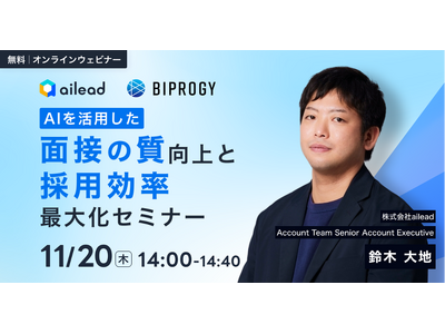 株式会社ailead(本社:東京都港区、代表取締役:杉山大幹)が提供する商談・面談解析クラウド「ailead(エーアイリード)」は、BIPROGY株式会社(本社:東京都江東区、代表取締役社長:齊藤昇)と共催で、無料オンラインセミナー「AIを活用した『面接の質』向上と『採用効率』最大化セミナー ~内定承諾率15%向上!AI解析で実現するデータドリブンな採用DX~」を2025年11月20日(木)に開催いたします。