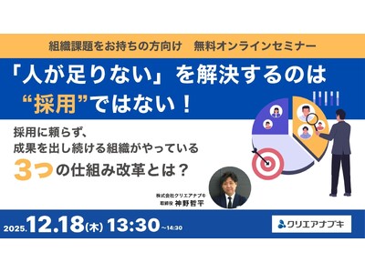 総合人材サービスの株式会社クリエアナブキ(本社:香川県高松市/代表取締役社長 楠戸 三則)は、2025年12月18日に無料オンラインセミナー「『人が足りない』を解決するのは、“採用”ではない!~採用に頼らず、成果を出し続ける組織がやっている3つの仕組み改革とは?」を開催します。