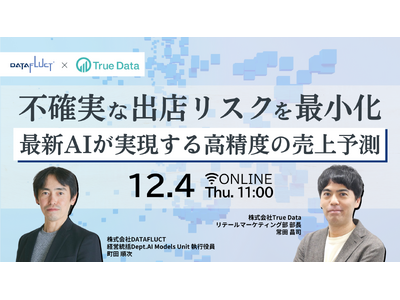 本セミナーでは、AIソリューション開発に強みを持つDATAFLUCTと、データマーケティング・DXサービスに強みを持つTrue Dataの共同開催により、最新のAI技術を活用して新規出店時の売上を高精度に予測する最新手法をわかりやすく解説します。