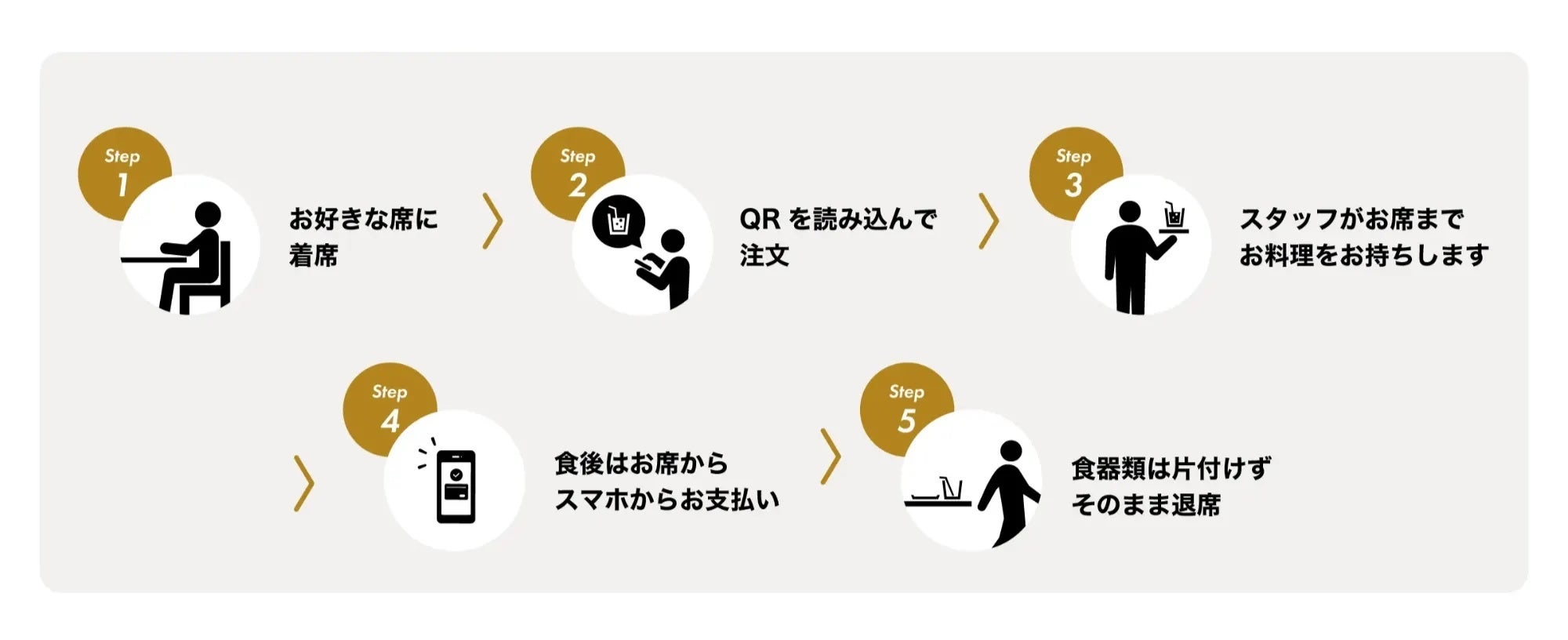 入店後、お席から移動することなく、ゆっくり料理を選び、注文することが可能。一般的なフードホール/フードコートと異なり、お連れ様と離れずに注文ができ、ご注文時の行列やお料理を取りに行くお手間、食器の返却も不要といたしました。