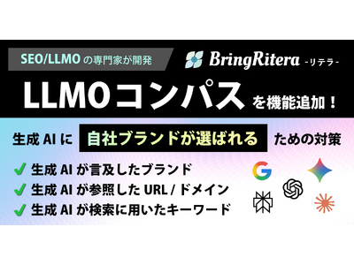 株式会社BringFlower(東京都新宿区、代表取締役:稲田 高洋)は、当社が開発・提供するSEO/LLMOの対策プラットフォーム「リテラ(BringRitera)」について、生成AIがユーザーの問いに対して参照したURLと、検索に用いた検索キーワードを可視化する機能「LLMOコンパス」を追加しました。「LLMOコンパス」には、生成AIがユーザーの問いに対して自社・競合のブランドをどの程度選んでいるかを、AIモデル別・期間別に把握できる機能もあり、AI時代の新しいマーケティング手法「LLMO(AI検索対策)」の羅針盤となります。
