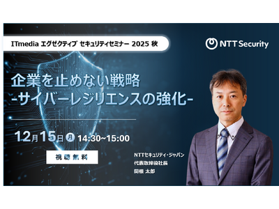NTTセキュリティ・ジャパン株式会社(本社:東京都千代田区、代表取締役社長:関根 太郎、以下NTTセキュリティ・ジャパン)は、2025年12月15日(月)に開催される、ITmedia主催イベント「ITmedia エグゼクティブセキュリティセミナー 2025 秋」にて講演を行います。