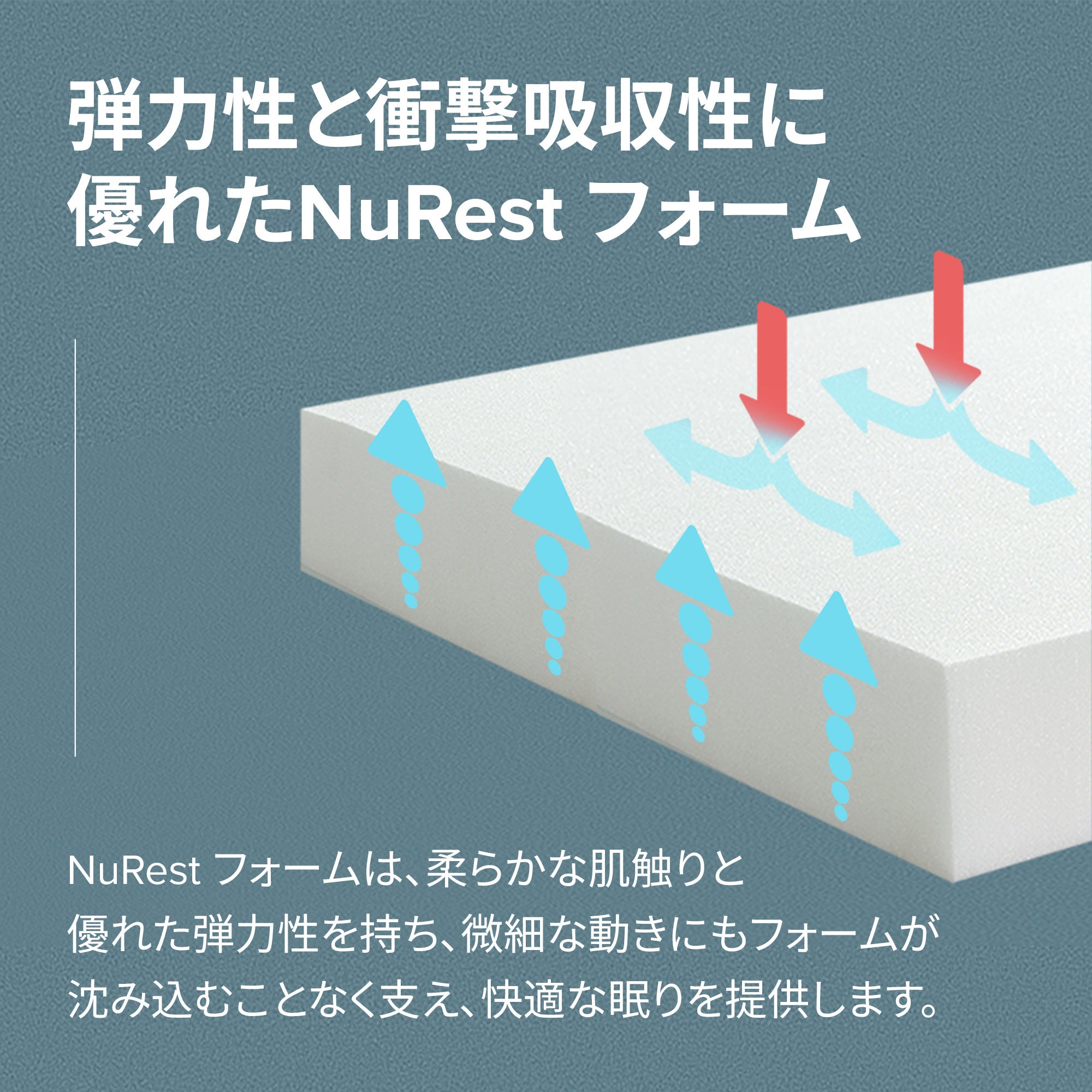 弾力性と衝撃吸収性に優れたNurestフォーム。Nurestフォームは柔らかな肌触りと優れた弾力性を持ち、微細な動きにもフォームが沈み込むことなく支え快適な眠りを提供します。