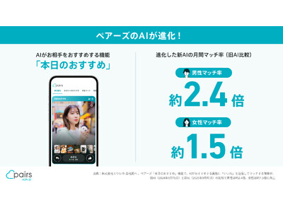 恋活・婚活マッチングアプリ「Pairs(ペアーズ)」を運営する株式会社エウレカ(本社:東京都港区、代表取締役CEO:山本竜馬、以下 ペアーズ)は、2024年10月から順次導入を開始した推薦AIにより、「いいね」を送ったお相手とマッチする確率(マッチ率)が大幅に向上しました。
