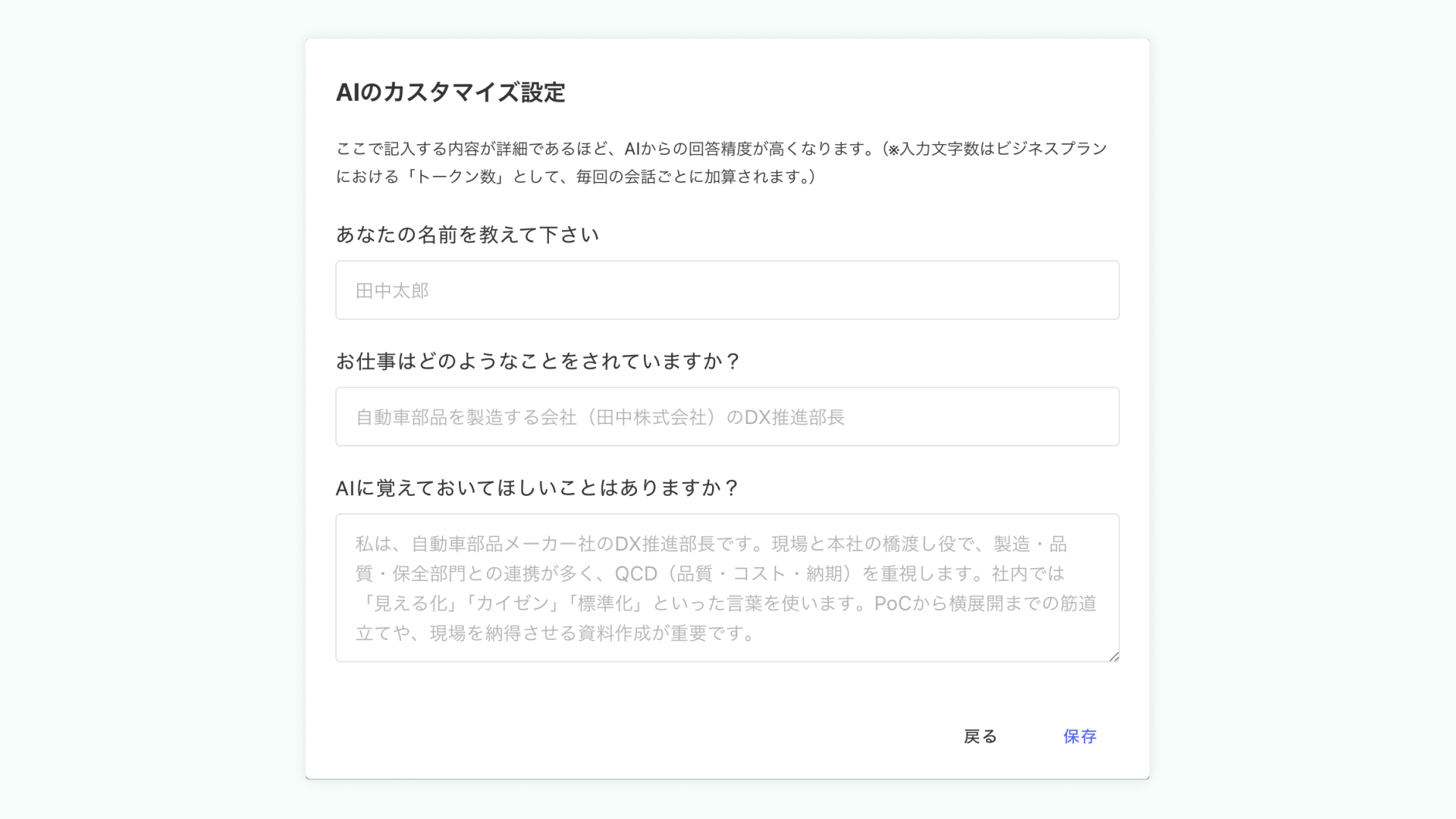 そこで、この度ChatSenseでは、個人ごとにメモリーを設定できる「パーソナライズ」機能をリリースしました。この機能では、ChatSenseで利用するAIに対して、あらかじめ前提となる情報(自身のニックネームや仕事の内容、好みなど)を提供しておくことができます。これにより、難しいプロンプトを毎度入力する必要なく、回答の質を高めることが可能になります。