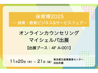 オンラインカウンセリングを提供する株式会社マイシェルパ(以下、当社)は、2025年11月20日(木)~21日(金)に東京都立産業貿易センター 浜松町館で開催される「保育博2025 ― 保育・教育ビジネス&サービスフェア―」へ出展します。【出展ブース:4F-A001】