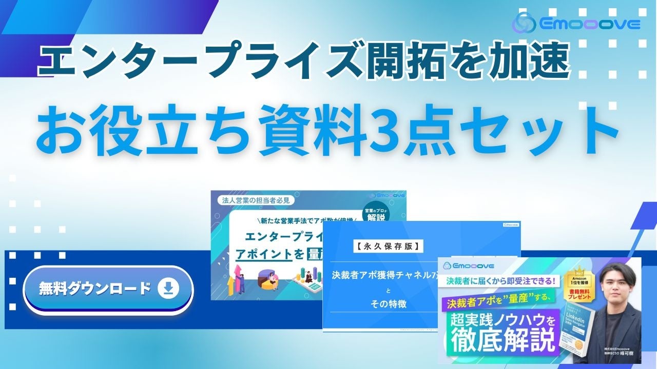 新時代の営業手法を提案する株式会社Emooove(本社:東京都渋谷区、代表取締役CEO:藤澤諒一)は、「エンタープライズ / 決裁者開拓を加速する」お役立ちコンテンツ3点セットを無料公開したことをお知らせします。
