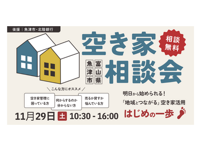 不動産の開発事業・リノベーション事業および空き家事業を展開する株式会社ジェクトワン(本社:東京都渋谷区、代表 取締役:大河 幹男 以下、ジェクトワン)は、空き家問題および防災課題解決に向けた「『明日から始められる!“地域とつながる”空き家活用 はじめの一歩』空き家相談会」を、2025年11月29日(土)に富山県魚津市、12月6日(土)に石川県金沢市で開催いたします。本イベントは、ジェクトワンが参画する「スムヤドスム」プロジェクトの一環※として実施するもので、10月25日(土)に開催した新潟県三条市での相談会に続く取り組みです。