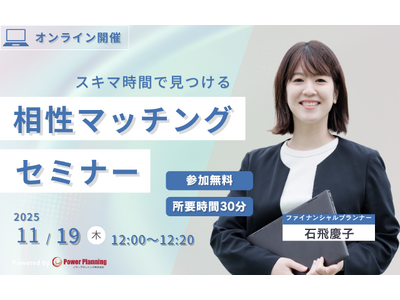 無料マネーセミナー提供サービス「アットセミナー」を運営しているパワープランニング株式会社が「11月19日(水) 12時」に「相性マッチングセミナー」というスキマ時間で自分に合ったFPを見つけられるオンラインセミナーを開催いたします。