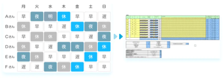 病院が行政に提出する「様式9(勤務表)」に準拠したフォーマットでの出力が可能。手作業による転記作業を削減し、業務効率化とミス防止を実現します。