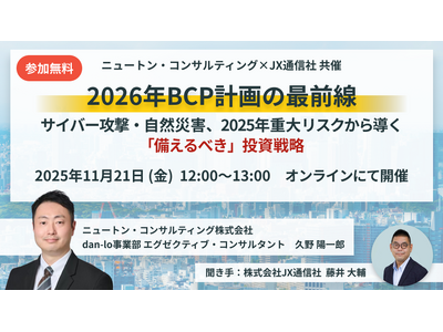 防災DXを推進する報道ベンチャーの株式会社JX通信社(東京都千代田区、代表取締役 米重 克洋、以下「JX通信社」)と、ニュートン・コンサルティング(東京都千代田区、代表取締役社長 副島 一也、以下「ニュートン・コンサルティング」)は、11月21日(金)共催ウェビナーを開催することをお知らせします。