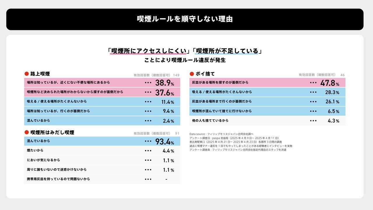 定性調査: 路上喫煙の理由として「喫煙所がわからない/探すのが面倒」(37.6%)、「近くにない/不便」(38.9%)、「場所が少ない」(11.4%)が上位を占める。喫煙所はみだし喫煙の理由としては、ほとんどの人が「混んでいるから」(93.4%)と回答。