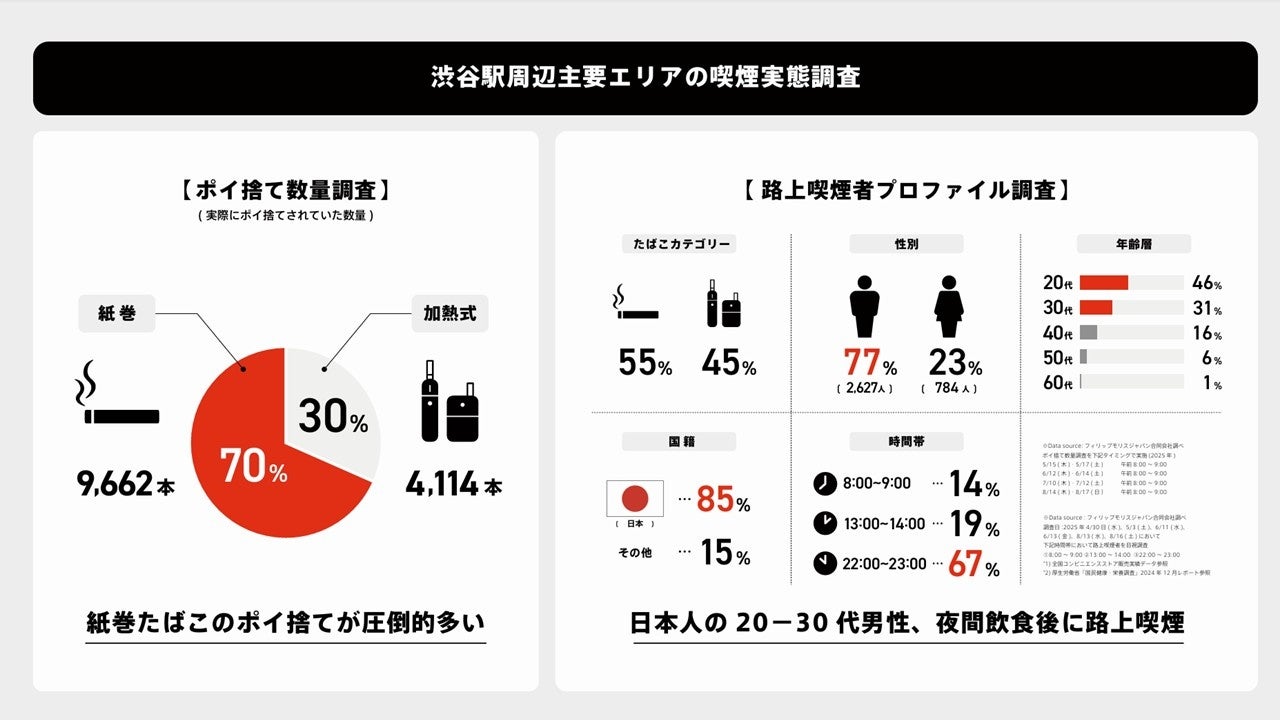 こうした声に応える形で、PMJ と渋谷未来デザインは 2025 年 4 月に渋谷グッドマナープロジェクトの一環として「Action for 0」プロジェクトを共同で発足、本プロジェクトでは、単なるマナー啓発に留まらず、喫煙実態調査に基づいた喫煙環境の根本的な改善を目指します。その第一歩として、2025 年 4 月から 8月にかけて渋谷駅周辺 8 エリアで大規模な実態調査を実施しました。