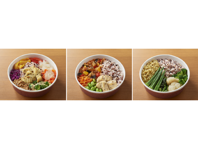 今回発売する「1/3日分の野菜を使った雑穀ごはん」は、不足しがちな野菜を手軽に摂取できるように考えた、温めるだけで食べられる1食分のプレートごはんで、「スパイスチキンと彩りサラダ」、「ラタトゥイユとペッパーチキン」、「スパイシーグリーンサラダ」の3種を発売します。