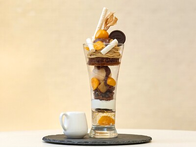 商品詳細:食用のほおずきは、果肉がやわらかく、ほのかな酸味と甘み、ほろ苦さが特徴です。今回のパフェでは、その個性を活かし、ほおずきをフレッシュ(生)、コンポート、ソース、チップスと4通りにアレンジ。パフェには、ほおずき(生)、チョコレートソースに和栗モンブランクリーム、メレンゲやほおずきチップスをトッピングし、バニラアイス、スフレショコラ、マロンアイス、渋皮マロン、ほおずき(生)、柑橘系洋酒(ソミュール)と白ワインのジュレとほおずきコンポートという多彩な構成となっています。別添えのほおずきソースをかけるとほおずきの爽やかさが甘みを引き立て、又違った味わいに。最後まで飽きることなく味わいいただける大人のパフェとなっています。