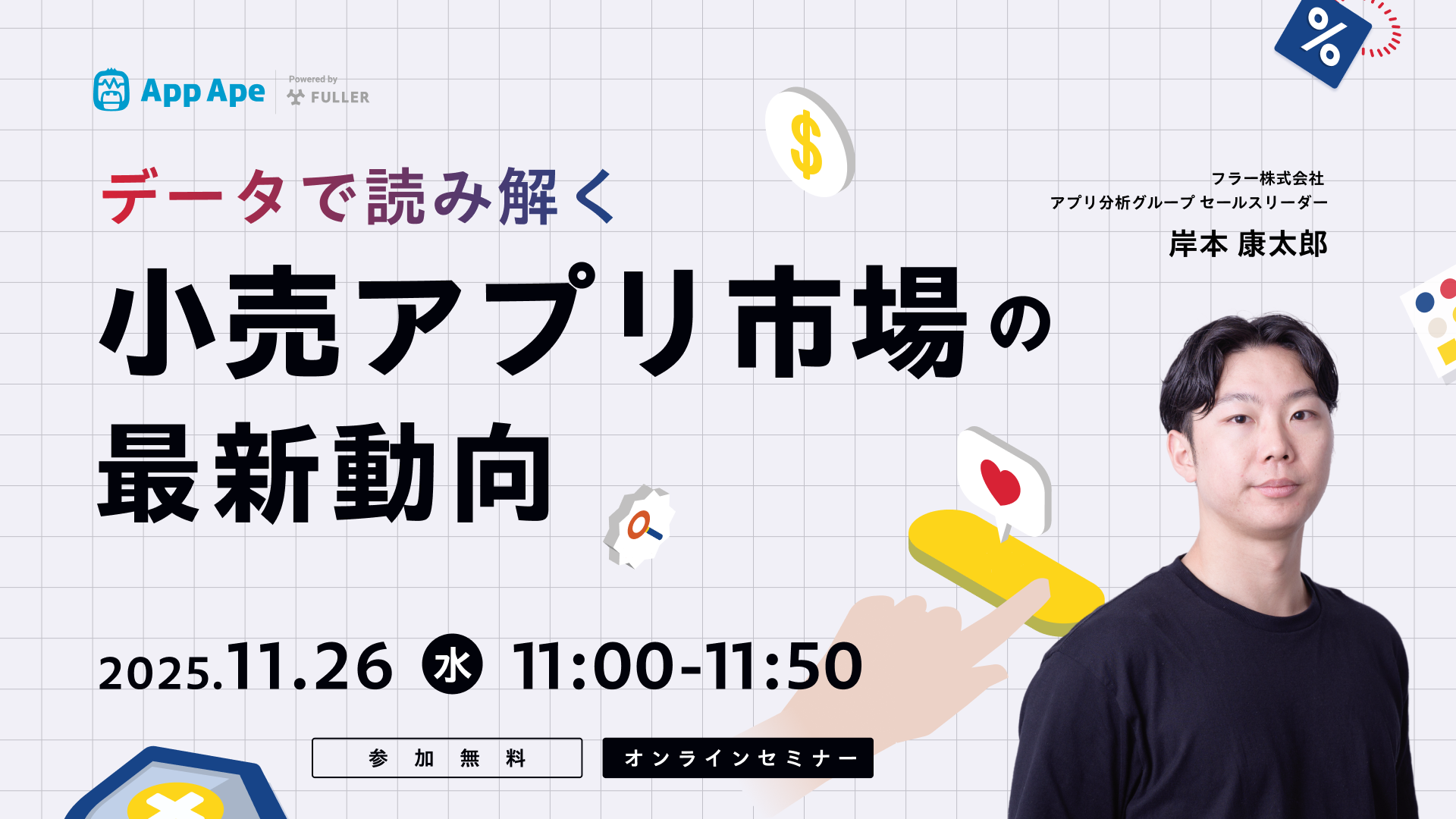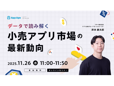 アプリ市場分析サービス「App Ape(アップ・エイプ)」を手がけるフラー株式会社(本社:新潟県新潟市、代表取締役社長:山崎将司、以下「フラー」)は、小売アプリ市場の最新動向を解説するオンラインセミナー「データで読み解く小売アプリ市場の最新動向」を2025年11月26日(水)に開催いたします。