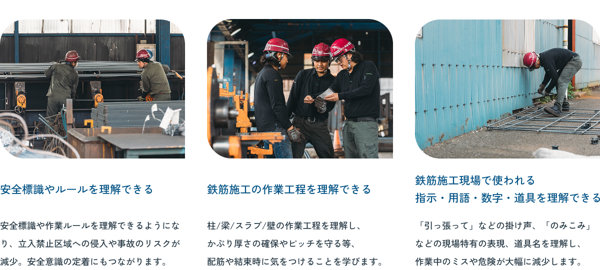 鉄筋施工の現場では、掛け声や作業指示が正しく伝わらず危険が生じたり、現場特有の数字・専門用語が理解できずミスが起きることがあります。こうした課題を根本から解消する内容となっています。