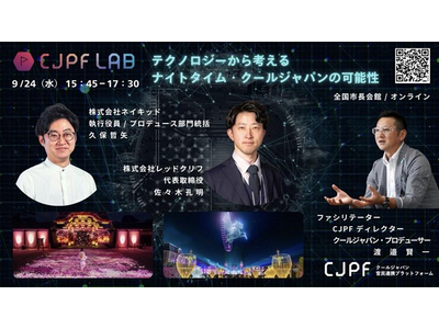 内閣府知的財産戦略推進事務局は2025年9月24日(水)に第一回 CJPF LAB 「テクノロジーから考えるナイトタイム・クールジャパンの可能性」を開催いたしました。本イベントには会場・オンライン合わせて約100名が参加し、夜間観光の新たな価値創造について活発な議論が交わされたことをお知らせいたします。