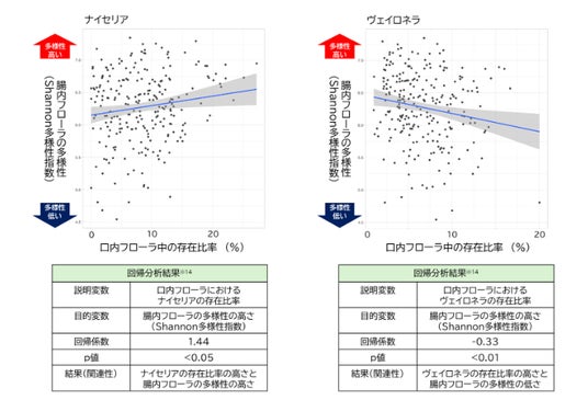 また、ナイセリア、ヴェイロネラについて、口内フローラ中の存在比率に着目すると、ナイセリアの存在比率が高い人ほど腸内フローラの多様性が高いこと、ヴェイロネラについては、存在比率が高い人ほど腸内フローラの多様性が低いことが分かりました(図3)。