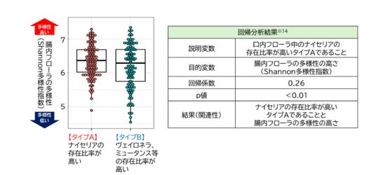 2タイプについて腸内フローラの多様性(Shannon多様性指数※13)との関連性を解析した結果、口内フローラ中のナイセリアの存在比率が高いタイプAは、腸内フローラの多様性が高い傾向にあることが示されました(図2)。