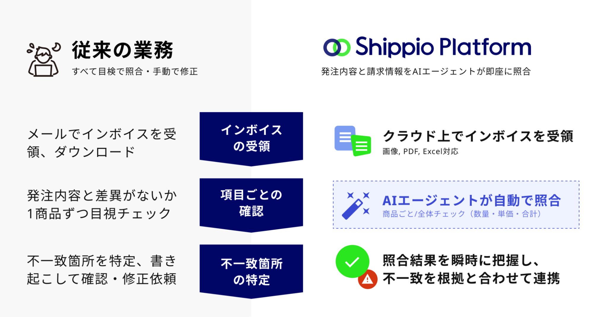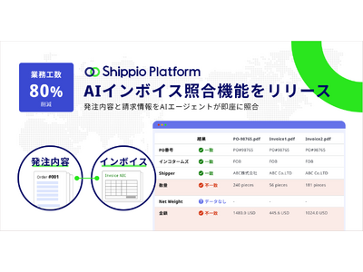 「国際物流を、アドバンストに」をビジョンに掲げ貿易DXを推進する株式会社Shippio(本社:東京都港区、代表取締役CEO:佐藤孝徳、以下Shippio)は、Shippio Platformで展開する荷主向け貿易管理クラウドにおいて、「AIインボイス照合機能」の提供を開始いたしました。本機能は、発注内容とインボイス(請求書)の内容とを、AIエージェントが即座に照合し情報の一致・不一致を検出する機能です。従来目検で行われていた照合作業を、最大80%削減する効果を見込んでいます。