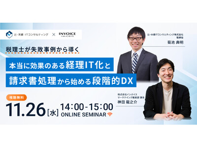 この度、株式会社インボイス(代表取締役社長:仁多見 斎 本社:東京都千代田区)は、辻・本郷ITコンサルティング株式会社(代表取締役社長:黒仁田 健 本社:東京都渋谷区)と、「失敗事例から導く本当に効果のある経理IT化と請求書処理から始める段階的DX」 というテーマで共催セミナーを開催致します。