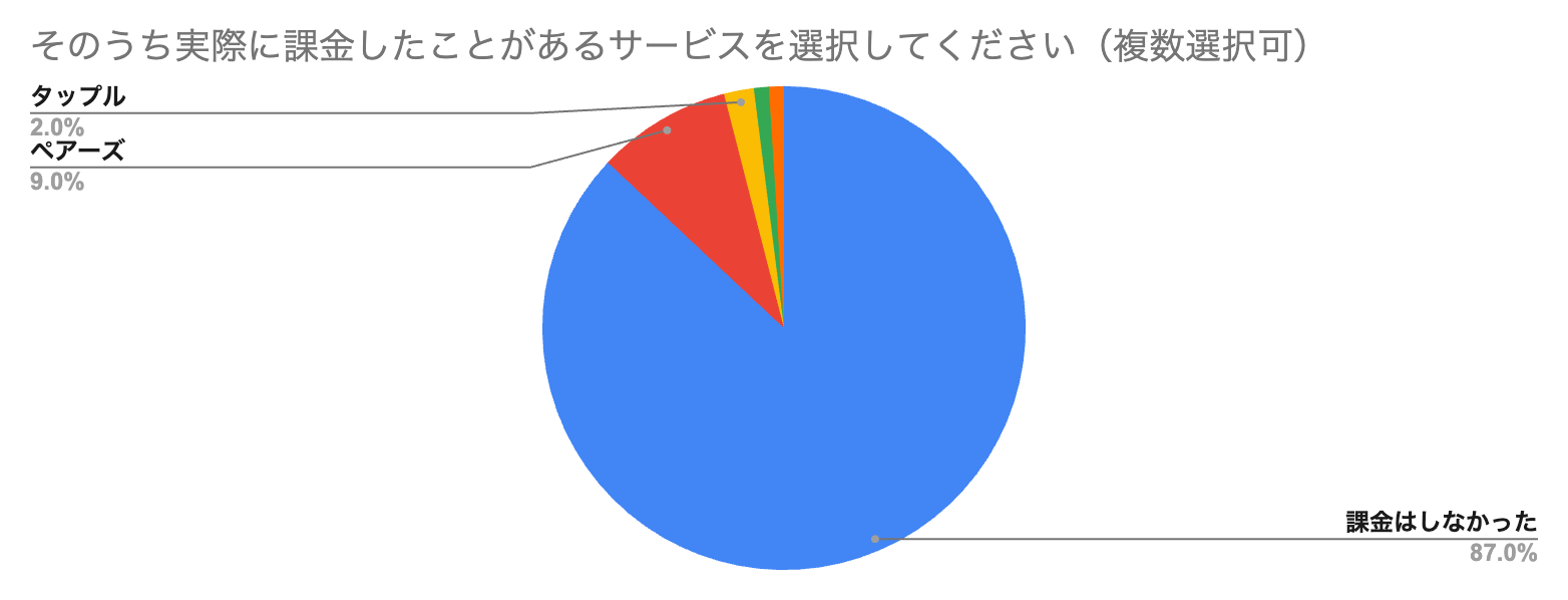 課金経験については無料で利用している女性が大半を占めており、「課金はしなかった」の回答が87.0%を占めました。一方で、最も課金経験が多かったのは「ペアーズ」で9.0%、次いで「タップル」2.0%という結果でした。