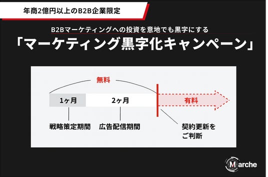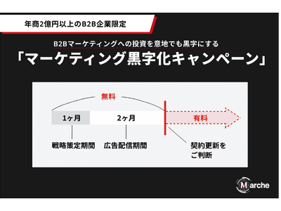 年商2億円以上のB2B企業様を対象とした「マーケティング黒字化キャンペーン」を実施いたします。2025年11月20日から12月4日までの期間中にご応募いただいた企業様に対し、サービス開始から3ヶ月間を無料でご提供いたします。